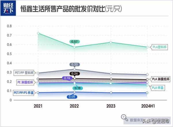 恒鑫生活所售产品的批发价很便宜,2024年上半年,其产品价格从高到低依次为PLA塑料杯、PET/PP塑料杯、PLA淋膜纸杯、PE淋膜纸杯、PLA杯盖、PET/PP/PS杯盖,售价分别是0.57元、0.27元、0.22元、0.19元、0.16元、0.08元。